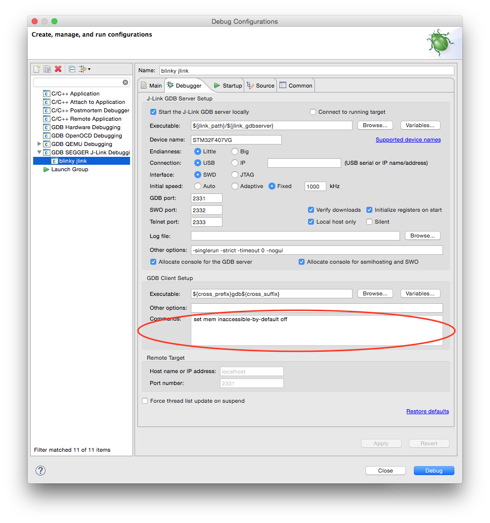 You should be able to add the custom GDB hooks under Debug Configuration -> GDB . Debugging* -> Your Configuration -> GDB Client Setup -> Commands